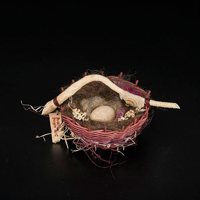 The nests are very special to me, perhaps because so much of nature goes into them: grasses, fibers, and twigs from streams and beaches as well as lily, iris, and crocosmia leaves from the garden. I fill them with soft wool fiber and add little found treasures. Each nest is a small quiet unique expression.