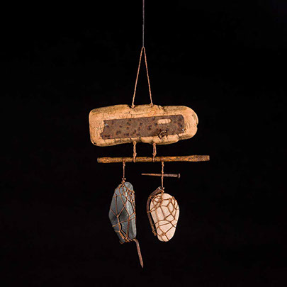 The basketry here began with a thought about combining stones I have collected with linen in an unusual way. The work evolved as I added other materials. I wondered if I could weave around a cairn. “Celebration” was the first – a stationary structure. I wondered then about a structure that might move – perhaps hanging from an interesting branch. Then I wondered what else I could add . . .