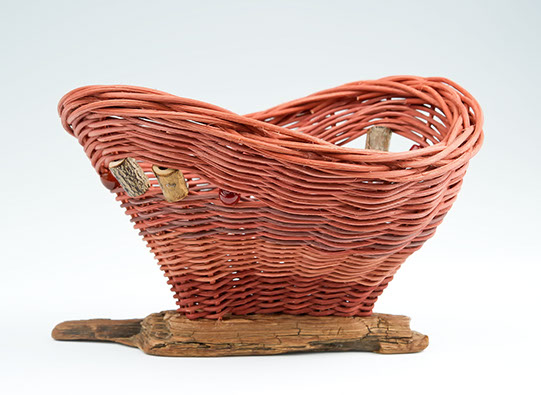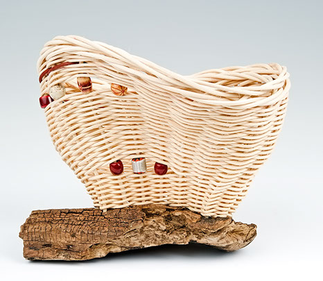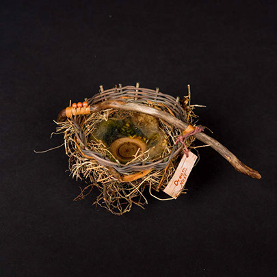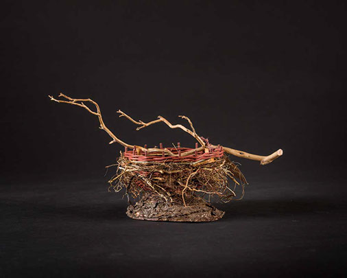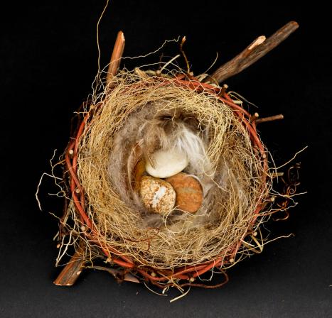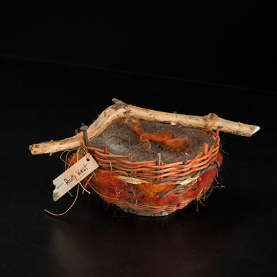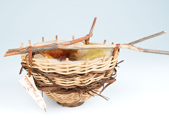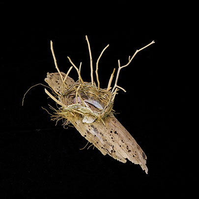 The nests are very special to me, perhaps because so much of nature goes into them: grasses, fibers, and twigs from streams and beaches as well as lily, iris, and crocosmia leaves from the garden. I fill them with soft wool fiber and add little found treasures. Each nest is a small quiet unique expression.