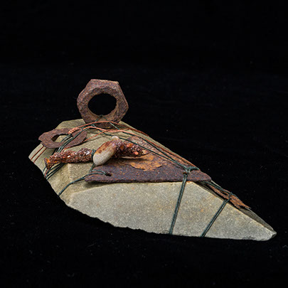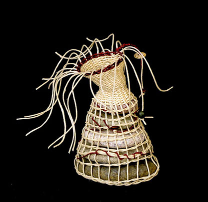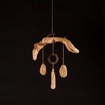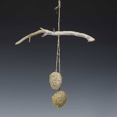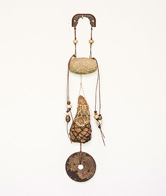 The basketry here began with a thought about combining stones I have collected with linen in an unusual way. The work evolved as I added other materials. I wondered if I could weave around a cairn. “Celebration” was the first – a stationary structure. I wondered then about a structure that might move – perhaps hanging from an interesting branch. Then I wondered what else I could add . . .