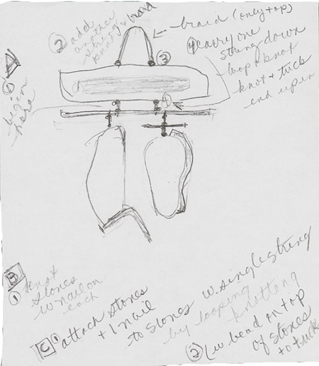 Once a piece of driftwood, or a stone, or a dream inspires me, I often start a new basket with a sketch. This is a sketch I did for "Stone, Rust and String V." The sketch combines the visual appearance, as well as the process I'll follow, and the list of raw materials that will go into the final design.